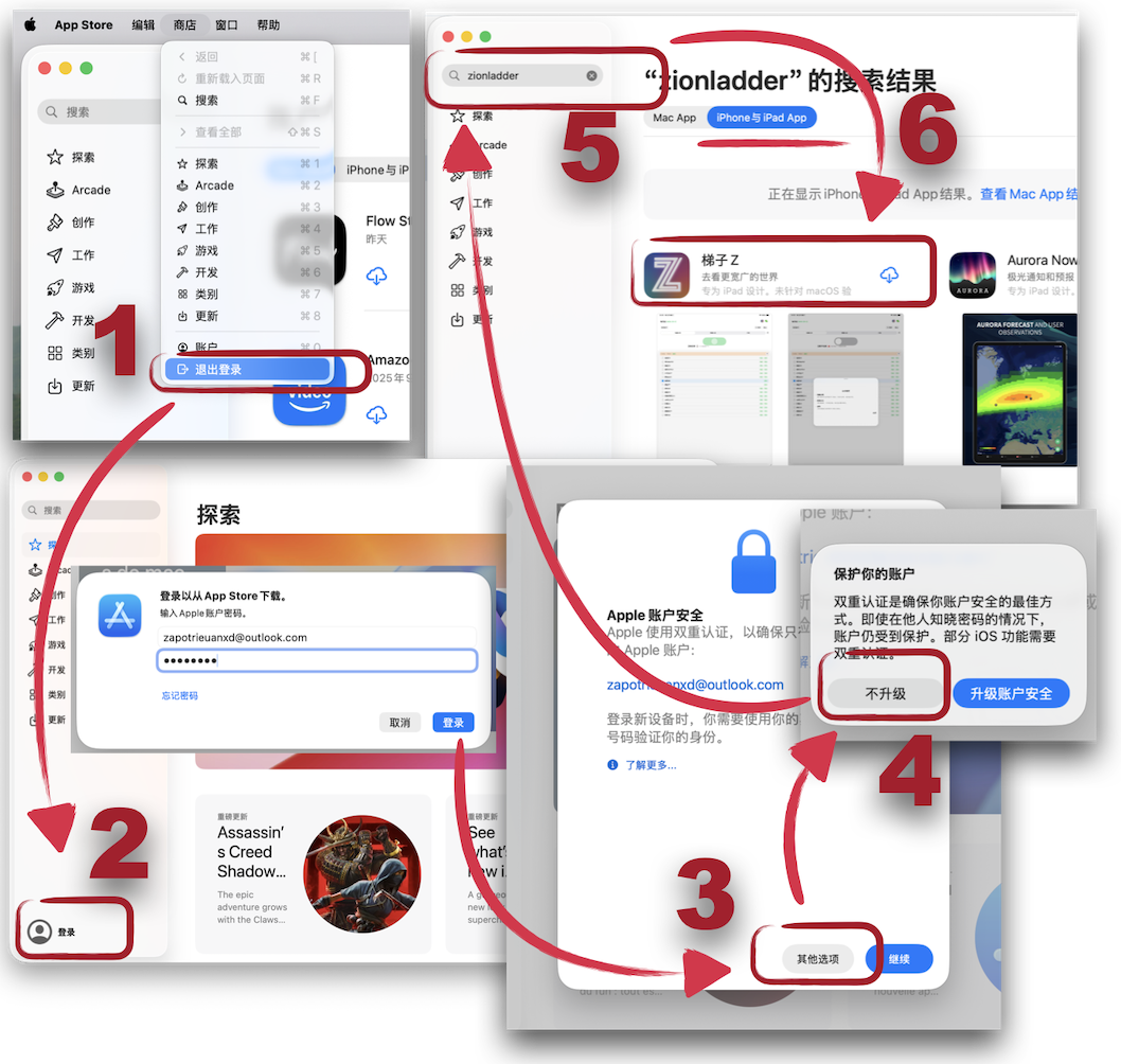1. 打开macOS应用商店, 然后从macOS顶部菜单栏退出登录当前Apple ID 2. 点击商店应用左下的登录按钮 3.4. 输入共享的Apple ID账号密码后,遇到提示,点击“其他选项” -> "不升级" 5. 搜索 "zionladder" 6. 在iPhone与iPad App类别里, 找到ZionLadder应用并下载